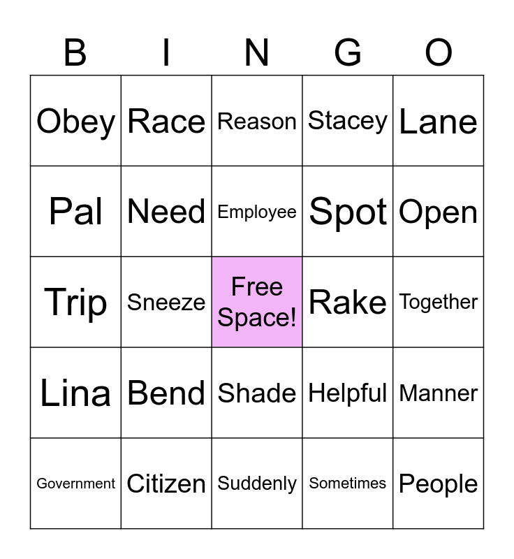 This bingo card has a free space and 24 words: Bend, Citizen, Employee, Government, Lane, Obey, Pal, Race, Rake, Shade, Spot, Trip, Helpful, Manner, Need, Sometimes, Together, Reason, Open, Sneeze, People, Lina, Stacey and Suddenly.