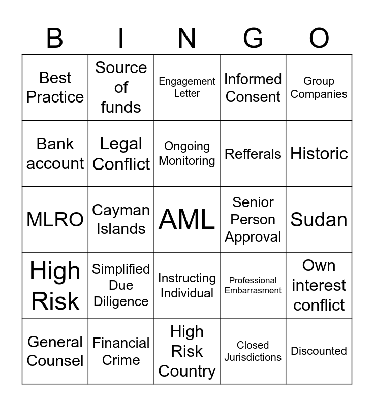 This bingo card has 50 words: China, AML, Terrorist Financing, High Risk Country, Simplified Due Diligence, Suspicious Activity Report, Source of funds, Source of wealth, Bank account, Commercial Conflict, Legal Conflict, Informed Consent, Own interest conflict, Professional Embarrasment, Independent advice, Enhanced Due Diligence, Ongoing Monitoring, Senior Person Approval, Subsidiaries, Group Companies, Cayman Islands, Closed Jurisdictions, Best Practice, Refferals, Dismissed, Discounted, Historic, Statue of Limitations, Engagement Letter, Instructing Individual, Beneficial owner, 25% or more, Reputation, Negative news, Financial Crime, Sanctions, Libya, Syria, Nigeria, Sudan, Interested Parties, Counterparties, Opposite Parties, Limited Scope, General Counsel, MLRO, PARM, Low Risk, High Risk and Allegations.