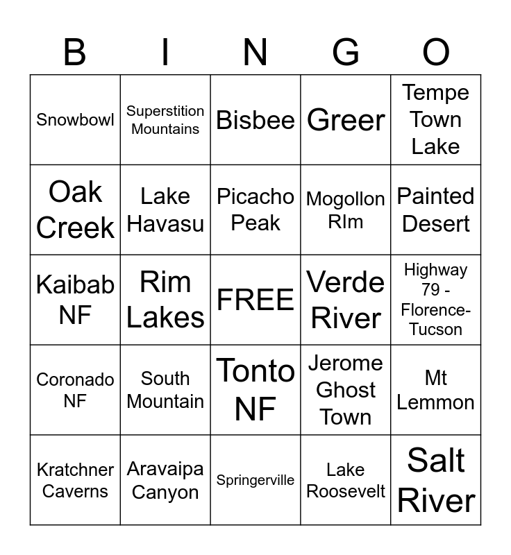 This bingo card has a free space and 53 words: Grand Canyon, Salt River, AZ 88, Lake Roosevelt, South Mountain, Camelback, Superstition Mountains, Antelope Canyon, Oak Creek, Watson Lake, Lake Havasu, Slide Rock, Mt Lemmon, Jerome Ghost Town, Petrified Forest, Kratchner Caverns, Picacho Peak, Verde River, Flat Iron, Tempe Town Lake, Rim Lakes, Lake Pleasant, Mogollon RIm, Snowbowl, Sunrise, Aravaipa Canyon, Canyon de Chelly, Horseshoe bend, Monument Valley, Painted Desert, Hole in the Rock, Mt. Humphrey’s, Four Peaks, Pinal Peak, Vermillion Cliffs, Globe-Young Highway, Greer, Springerville, Bisbee, Sonoita, Tucson, Madera Canyon, Highway 79 - Florence-Tucson, US 60 - east of Superior, Superior, Tonto NF, Apache Sitgraves NF, Coconino NF, Kaibab NF, Coronado NF, Prescott NF, Canyon Lake and Apache Lake.