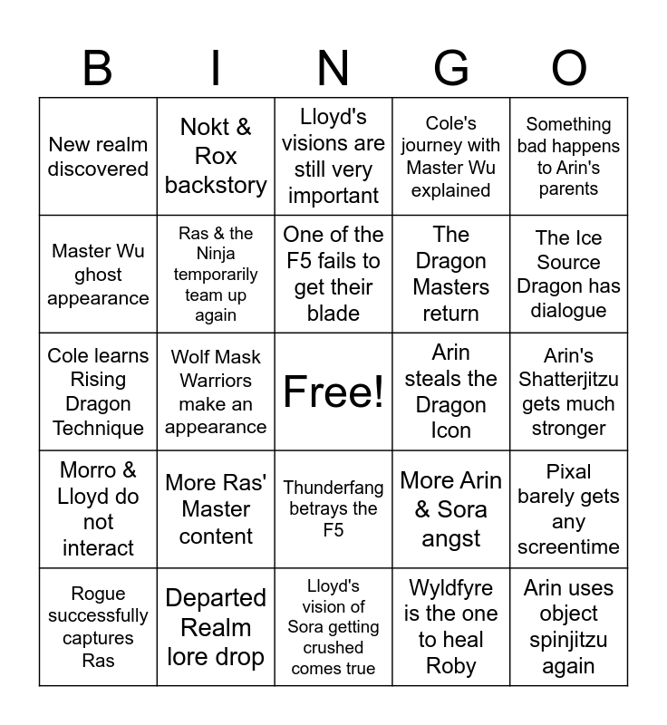 This bingo card has a free space and 24 words: More Ras' Master content, Departed Realm lore drop, One of the F5 fails to get their blade, Rogue successfully captures Ras, Something bad happens to Arin's parents, New realm discovered, Master Wu ghost appearance, Nokt & Rox backstory, Arin steals the Dragon Icon, Thunderfang betrays the F5, The Dragon Masters return, Cole learns Rising Dragon Technique, More Arin & Sora angst, Pixal barely gets any screentime, Ras & the Ninja temporarily team up again, Wyldfyre is the one to heal Roby, Arin's Shatterjitzu gets much stronger, Lloyd's visions are still very important, The Ice Source Dragon has dialogue, Wolf Mask Warriors make an appearance, Arin uses object spinjitzu again, Morro & Lloyd do not interact, Cole's journey with Master Wu explained and Lloyd's vision of Sora getting crushed comes true.