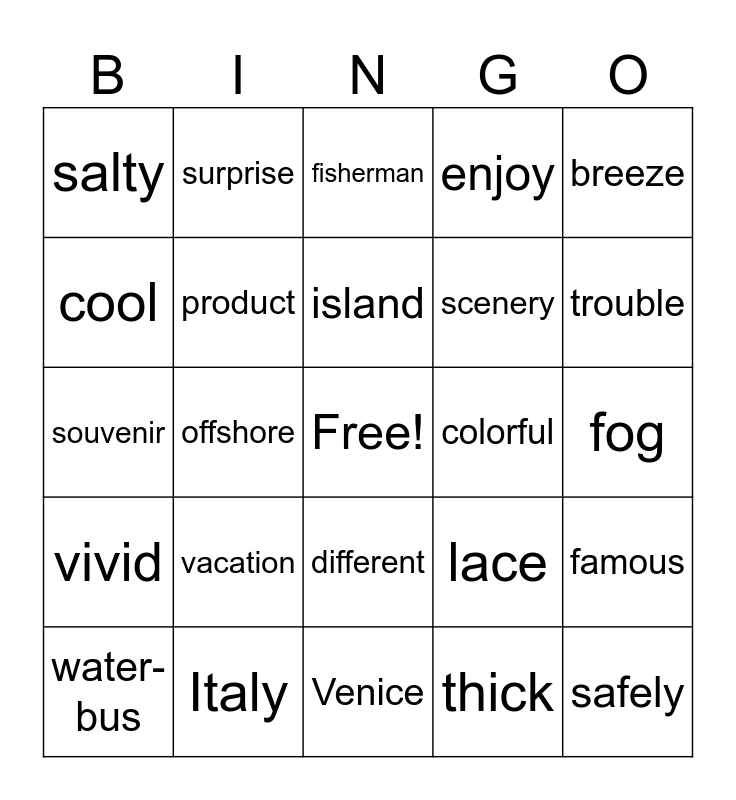 This bingo card has a free space and 24 words: vacation, Italy, island, water-bus, breeze, salty, cool, surprise, colorful, different, scenery, souvenir, lace, famous, product, thick, fog, fisherman, trouble, offshore, safely, vivid, enjoy and Venice.