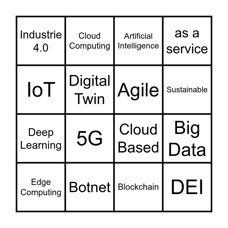 This bingo card has 16 words: Botnet, Big Data, Artificial Intelligence, Industrie 4.0, Deep Learning, Cloud Computing, Cloud Based, Blockchain, IoT, Digital Twin, Edge Computing, as a service, 5G, Sustainable, Agile and DEI.