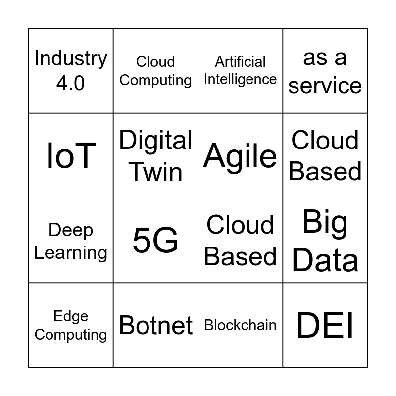 This bingo card has 16 words: Botnet, Big Data, Artificial Intelligence, Industry 4.0, Deep Learning, Cloud Computing, Cloud Based, Blockchain, IoT, Digital Twin, Edge Computing, as a service, 5G, Cloud Based, Agile and DEI.