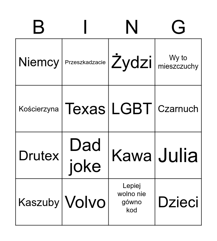 This bingo card has 16 words: Volvo, Julia, Żydzi, Niemcy, Drutex, Przeszkadzacie, Kawa, Lepiej wolno nie gówno kod, Kościerzyna, Texas, Kaszuby, Wy to mieszczuchy, Dad joke, Czarnuch, LGBT and Dzieci.