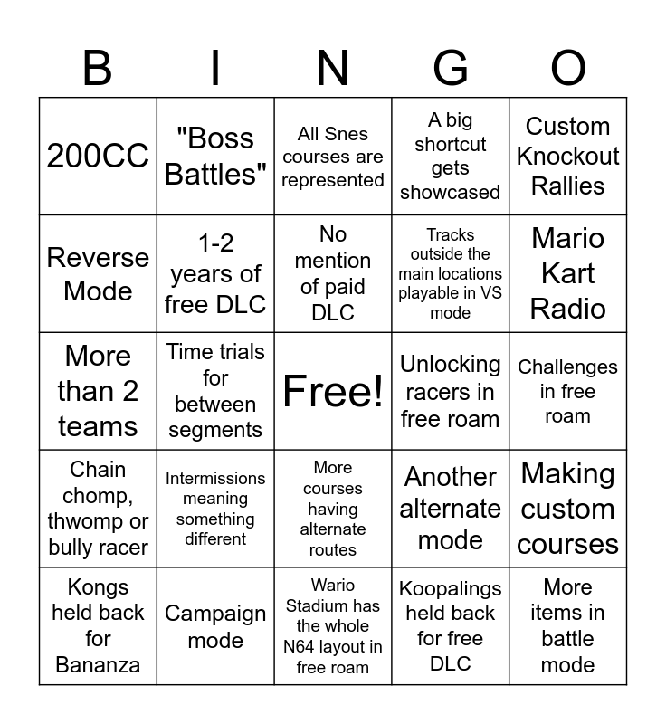 This bingo card has a free space and 24 words: Intermissions meaning something different, Campaign mode, No mention of paid DLC, Kongs held back for Bananza, Custom Knockout Rallies, 200CC, Reverse Mode, "Boss Battles", Unlocking racers in free roam, More courses having alternate routes, Tracks outside the main locations playable in VS mode, More than 2 teams, Another alternate mode, Making custom courses, 1-2 years of free DLC, Koopalings held back for free DLC, Challenges in free roam, All Snes courses are represented, Mario Kart Radio, Time trials for between segments, More items in battle mode, Chain chomp, thwomp or bully racer, A big shortcut gets showcased and Wario Stadium has the whole N64 layout in free roam.