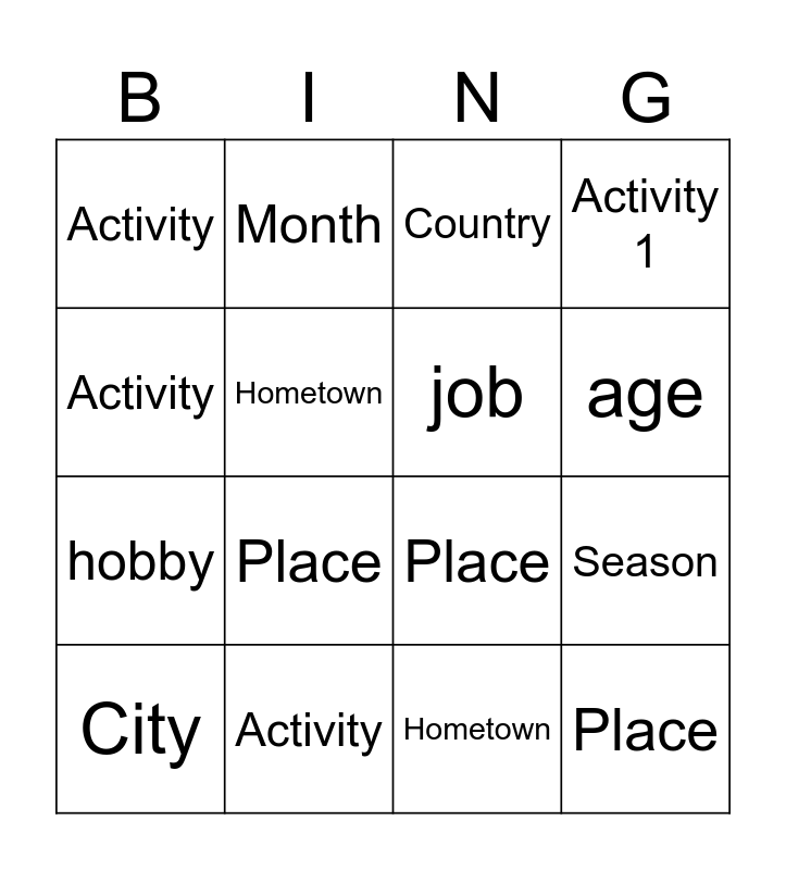 This bingo card has 20 words: Season, name, Country, Place, City, Activity, Activity, Activity, hobby, Month, Place, Place, Hometown, Place, job, Age, age, Activity 1, Hometown and Place 2.