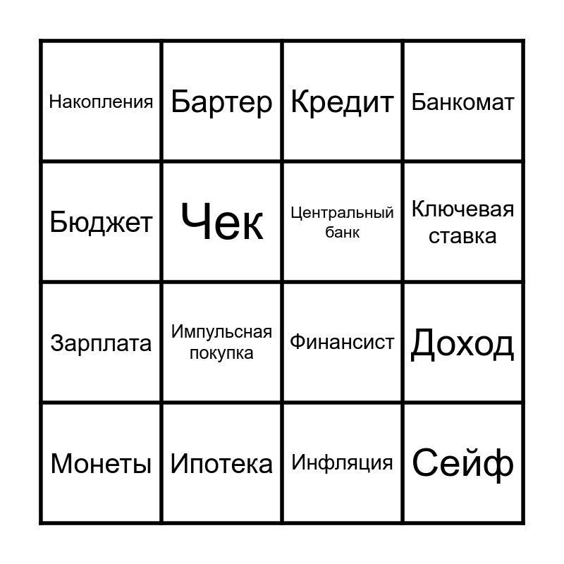 This bingo card has 50 words: Free!, Монеты, Банкнота, Деньги, Валюта, Рубль, Бартер, Сдача, Чек, Банк, Центральный банк, Банкомат, Дебетовая карта, Кредитная карта, Кэшбэк, Вклад, Ключевая ставка, Ипотека, Страхование вкладов, Бюджет, Доход, Расход, Накопления, Зарплата, Финансовая подушка, Копилка, Импульсная покупка, Скидка, Кредит, Процентная ставка, Дефицит бюджета, Долговая яма, Налоги, Акция, Облигация, Инвестор, Дивиденды, Актив, Пассив, Инфляция, Рецессия, Криптовалюта, NFC-платёж, Фишинг, Дроппер, Финансист, Трейдер, Фриланс, Сейф and Эмиссия.
