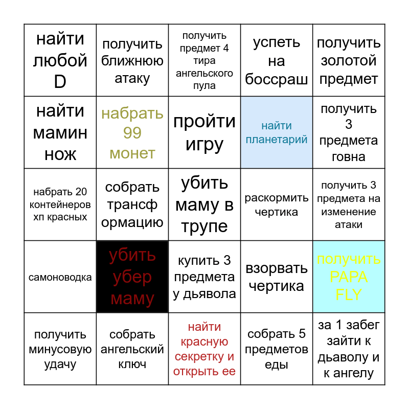 This bingo card has a free space and 24 words: убить убер маму, собрать ангельский ключ, пройти игру, получить минусовую удачу, получить золотой предмет, найти любой D, найти мамин нож, получить ближнюю атаку, раскормить чертика, купить 3 предмета у дьявола, найти планетарий, набрать 20 контейнеров хп красных, взорвать чертика, получить PAPA FLY, набрать 99 монет, собрать 5 предметов еды, получить 3 предмета на изменение атаки, получить предмет 4 тира ангельского пула, получить 3 предмета говна, собрать трансф ормацию, за 1 забег зайти к дьаволу и к ангелу, самоноводка, успеть на боссраш and найти красную секретку и открыть ее.