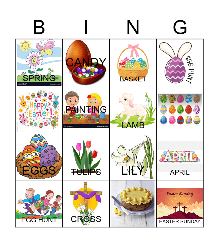 This bingo card has 20 images and 14 words: APRIL, CHOCOLATE BUNNY, BASKET, EASTER BUNNY, EGG HUNT, CROSS, SPRING, EGGS, CANDY, TULIPS, LILY, PAINTING, EASTER SUNDAY and LAMB.