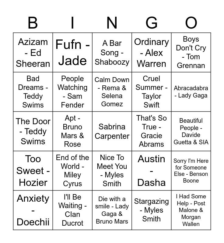 This bingo card has a free space and 31 words: Die with a smile - Lady Gaga & Bruno Mars, Messy - Lola Young, Apt - Bruno Mars & Rose, Pink Pony Club - Chappell Roan, Azizam - Ed Sheeran, A Bar Song - Shaboozy, People Watching - Sam Fender, Austin - Dasha, That's So True - Gracie Abrams, Stargazing - Myles Smith, Beautiful People - Davide Guetta & SIA, I Had Some Help - Post Malone & Morgan Wallen, Angel of My Dreams - Jade, Beautiful Things - Benson Boone, Abracadabra - Lady Gaga, The Giver - Chappell Roan, Sorry I'm Here for Someone Else - Benson Boone, End of the World - Miley Cyrus, Too Sweet - Hozier, Nice To Meet You - Myles Smith, Boys Don't Cry - Tom Grennan, Little Dreaming - Cian Ducrot, Anxiety - Doechii, Fufn - Jade, Cruel Summer - Taylor Swift, Bad Dreams - Teddy Swims, Ordinary - Alex Warren, The Door - Teddy Swims, I'll Be Waiting - CIan Ducrot, Calm Down - Rema & Selena Gomez and Houdini - Eminem.