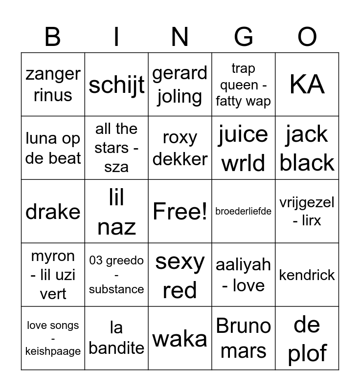 This bingo card has a free space and 24 words: 03 greedo - substance, la bandite, roxy dekker, love songs - keishpaage, KA, zanger rinus, luna op de beat, schijt, broederliefde, sexy red, juice wrld, drake, aaliyah - love, kendrick, all the stars - sza, Bruno mars, vrijgezel - lirx, gerard joling, jack black, lil naz, de plof, myron - lil uzi vert, trap queen - fatty wap and waka.
