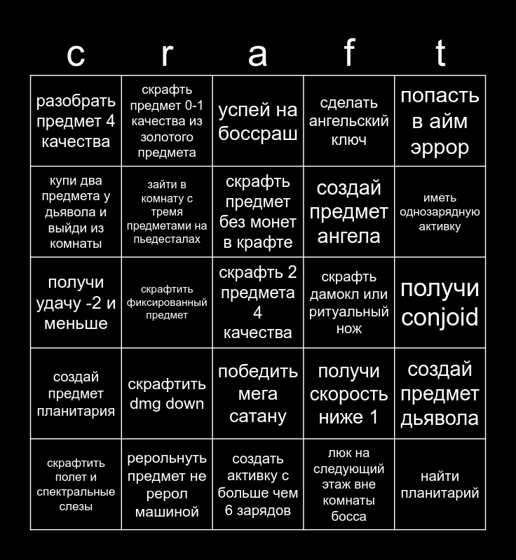 This bingo card has a free space and 24 words: скрафтить dmg down, рерольнуть предмет не рерол машиной, скрафть предмет без монет в крафте, скрафтить полет и спектральные слезы, попасть в айм эррор, разобрать предмет 4 качества, купи два предмета у дьявола и выйди из комнаты, скрафть предмет 0-1 качества из золотого предмета, скрафть дамокл или ритуальный нож, победить мега сатану, создай предмет ангела, получи удачу -2 и меньше, получи скорость ниже 1, создай предмет дьявола, зайти в комнату с тремя предметами на пьедесталах, люк на следующий этаж вне комнаты босса, получи conjoid, успей на боссраш, иметь однозарядную активку, скрафтить фиксированный предмет, найти планитарий, создай предмет планитария, сделать ангельский ключ and создать активку с больше чем 6 зарядов.