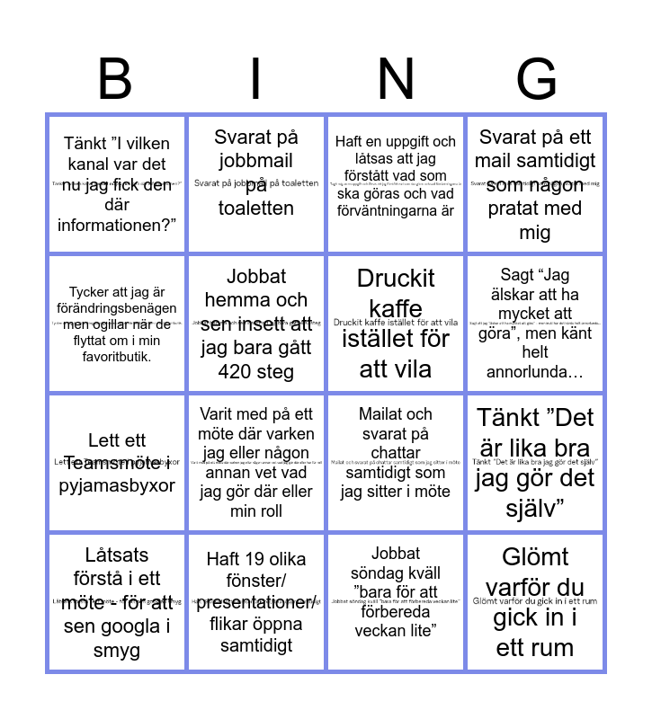 This bingo card has 16 images and 16 words: Haft 19 olika fönster/ presentationer/ flikar öppna samtidigt, Tänkt ”Det är lika bra jag gör det själv”, Haft en uppgift och låtsas att jag förstått vad som ska göras och vad förväntningarna är, Tänkt ”I vilken kanal var det nu jag fick den där informationen?”, Lett ett Teamsmöte i pyjamasbyxor, Svarat på jobbmail på toaletten, Mailat och svarat på chattar samtidigt som jag sitter i möte, Jobbat söndag kväll ”bara för att förbereda veckan lite”, Tycker att jag är förändringsbenägen men ogillar när de flyttat om i min favoritbutik., Jobbat hemma och sen insett att jag bara gått 420 steg, Låtsats förstå i ett möte - för att sen googla i smyg, Svarat på ett mail samtidigt som någon pratat med mig, Varit med på ett möte där varken jag eller någon annan vet vad jag gör där eller min roll, Sagt “Jag älskar att ha mycket att göra”, men känt helt annorlunda…, Druckit kaffe istället för att vila and Glömt varför du gick in i ett rum.