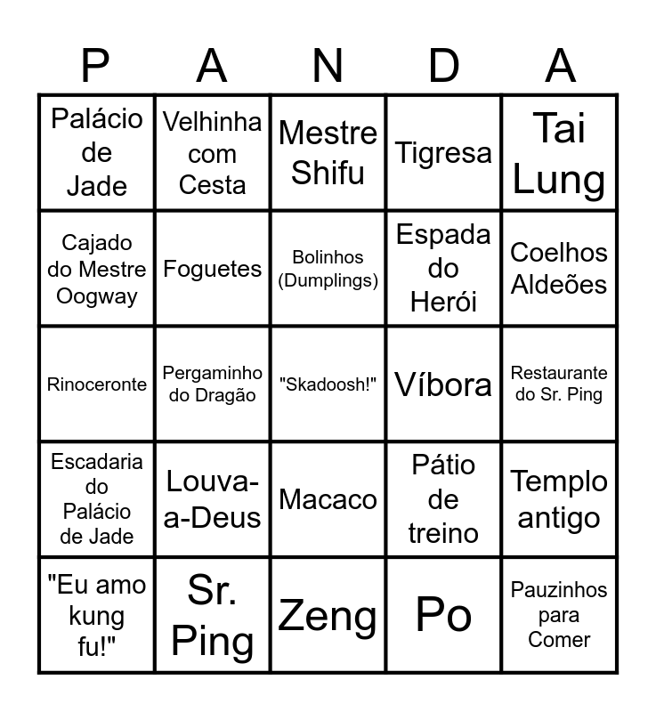 This bingo card has 43 words: Free!, "Skadoosh!", "Não existe ingrediente secreto", "Eu amo kung fu!", "Você foi escolhido", Po, Mestre Shifu, Mestre Oogway, Tai Lung, Sr. Ping, Tigresa, Víbora, Macaco, Louva-a-Deus, Grou, Zeng, Comandante Vachir, Rinoceronte, Porcos Aldeões, Coelhos Aldeões, Velhinha com Cesta, Po em Criança, Vale da Paz, Palácio de Jade, Chorn-Gom, Restaurante do Sr. Ping, Salão do Dragão, Árvore da Sabedoria, Pátio de treino, Escadaria do Palácio de Jade, Câmara da Escolha, Templo antigo, Montanhas do Vale, Pergaminho do Dragão, Noodles, Tigela especial do Sr. Ping, Pauzinhos para Comer, Bolinhos (Dumplings), Cajado do Mestre Oogway, Espada do Herói, Colar do Mestre Shifu, Foguetes and Bandeja de madeira.