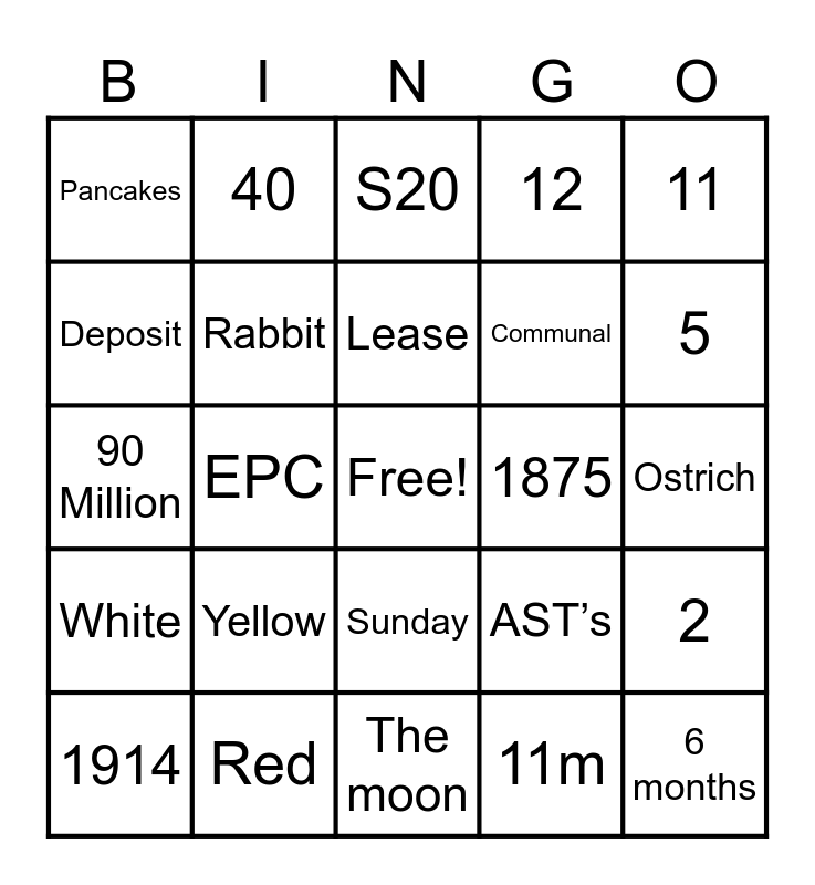 This bingo card has a free space and 44 words: 5 Years, 6 months, Qube, 1914, 18m, 11m, S20, 80 Million, 11, Red, 12, 1875, Sunday, Yellow, 1963, The moon, Lent, 90 Million, 3, 5, 40, Cadbury, Kinder Surprise, Pancakes, Buck, Ostrich, Dr Seuss, beans, AST’s, White, Thumper, 2, 3, 22, EPC, Section 21, Damp, Eviction, Lease, Deposit, Communal, EICR, Rabbit and Insurance.