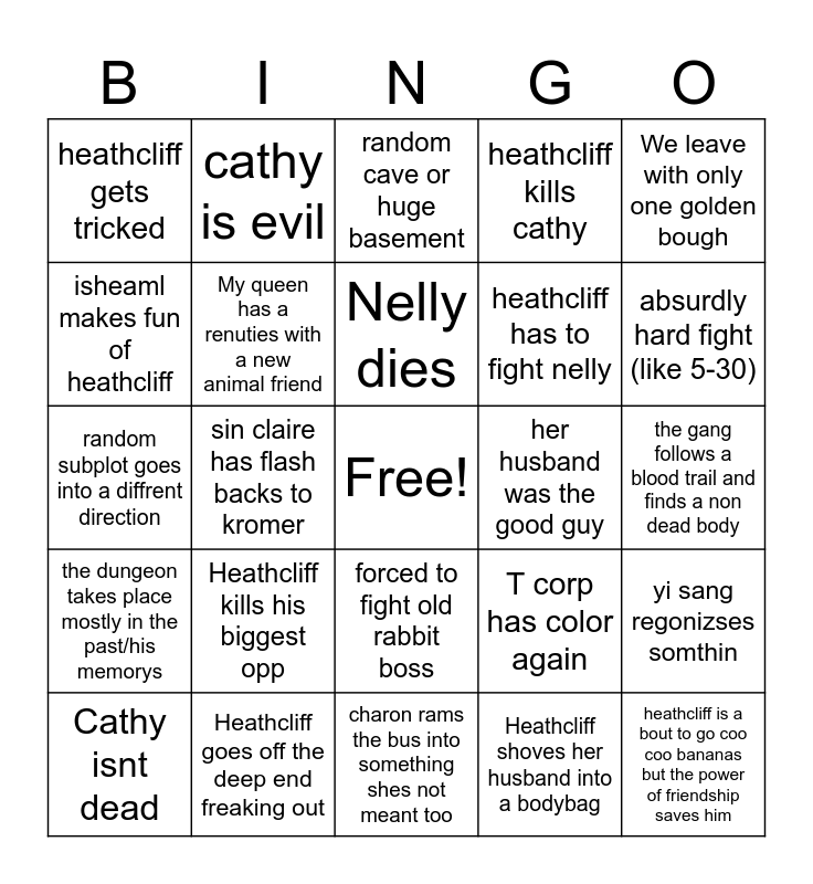 This bingo card has a free space and 24 words: Heathcliff kills his biggest opp, Heathcliff goes off the deep end freaking out, Nelly dies, Cathy isnt dead, We leave with only one golden bough, heathcliff gets tricked, isheaml makes fun of heathcliff, cathy is evil, her husband was the good guy, forced to fight old rabbit boss, heathcliff has to fight nelly, random subplot goes into a diffrent direction, T corp has color again, yi sang regonizses somthin, My queen has a renuties with a new animal friend, Heathcliff shoves her husband into a bodybag, the gang follows a blood trail and finds a non dead body, random cave or huge basement, absurdly hard fight (like 5-30), sin claire has flash backs to kromer, heathcliff is a bout to go coo coo bananas but the power of friendship saves him, the dungeon takes place mostly in the past/his memorys, heathcliff kills cathy and charon rams the bus into something shes not meant too.