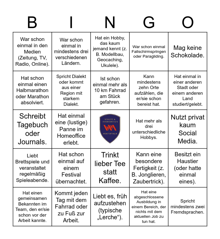 This bingo card has a free space and 50 words: Hat mehr als drei Geschwister., Spricht mindestens zwei Fremdsprachen., Ist schon einmal umgezogen, um zu studieren oder zu arbeiten., Liebt es, früh aufzustehen (typische „Lerche“)., Hat schon einmal auf einem Festival übernachtet., Kann ein Musikinstrument spielen., War schon einmal in mindestens drei verschiedenen Ländern., Geht gerne wandern oder klettern., Hat schon einmal einen Halbmarathon oder Marathon absolviert., Isst lieber herzhaft als süß., Spricht Dialekt oder kommt aus einer Region mit starkem Dialekt., War schon einmal Fallschirmspringen oder Paragliding., Besitzt ein Haustier (oder hatte einmal eines)., Kann eine besondere Fertigkeit (z. B. Jonglieren, Zaubertrick)., Hat ein Ehrenamt oder engagiert sich freiwillig., Lebt in einer Wohngemeinschaft (WG) oder hat schon in einer gewohnt., Ist schon einmal mehr als 10 km Fahrrad am Stück gefahren., Hat mehr als drei unterschiedliche Hobbys., Kann auf Anhieb drei Biersorten oder Weinsorten aufzählen, die er/sie mag., Mag keine Schokolade., Hat einmal eine (lustige) Panne im Homeoffice erlebt., Hat eine abgeschlossene Ausbildung in einem Bereich, der nichts mit dem aktuellen Job zu tun hat., War schon einmal in den Medien (Zeitung, TV, Radio, Online)., Kann mindestens zehn Orte aufzählen, die er/sie schon bereist hat., Hat ein altes Kinderfoto im Geldbeutel oder auf dem Handy., Ist Vegetarierin oder Veganerin., Hat einmal in einer anderen Stadt oder einem anderen Land studiert/gelebt., Liebt Horrorfilme oder True-Crime-Formate., Hat ein Hobby, das kaum jemand kennt (z. B. Modellbau, Geocaching, Ukulele)., Trinkt lieber Tee statt Kaffee., Hat einen besonderen Spitznamen aus der Schulzeit., Besitzt mehr als 50 Bücher (oder E-Books)., Kann ein Gericht aus dem Stand kochen, ohne Rezept., Ist im Team am längsten oder am kürzesten dabei (Firmenzugehörigkeit)., Kommt jeden Tag mit dem Fahrrad oder zu Fuß zur Arbeit., Hat eine lustige Tradition mit Freund*innen oder der Familie (z. B. Brettspielabend)., Ist Expert*in für ein ungewöhnliches Thema (z. B. Pilzkunde, Astronomie, altes Handwerk)., Hat einen grünen Daumen und pflegt (Zimmer-)Pflanzen., Ist schon einmal mit dem Rucksack durch ein Land gereist., Nutzt privat kaum Social Media., Kann sehr gut improvisieren und spontan auf Ideen reagieren., Hat ein ungewöhnliches Lieblingsessen oder -getränk., Sammelt etwas (z. B. Briefmarken, Schallplatten, Tassen)., Trägt heute ein Kleidungsstück in der Lieblingsfarbe., Hat einen gemeinsamen Bekannten im Team, den er/sie schon vor der Arbeit kannte., Schreibt Tagebuch oder Journals., Ist schon einmal mit einem Nachtzug gereist., Hat schon einmal ein Musikinstrument gebaut oder restauriert., Liebt Brettspiele und veranstaltet regelmäßig Spieleabende. and Hat schon einmal an einem Kreativkurs teilgenommen (Töpfern, Malen, Tanzkurs etc.)..