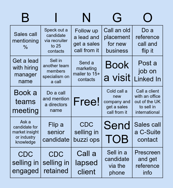 This bingo card has a free space and 24 words: Flip a senior candidate, CDC selling in retained, Send a marketing mailer to 15+ contacts, CDC selling in engaged, Do a reference call and flip it, Sales call mentioning %, Get a lead with hiring manager name, Speck out a candidate via recruiter to 25 contacts, Cold call a new company and get a sales call from it, CDC selling in buzzi ops, Book a visit, Book a teams meeting, Send TOB, Sales call a C-Suite contact, Sell in another team members specialism on a call, Sell in a candidate via the phone, Call a client with an office out of the UK to sell in international, Follow up a lead and get a sales call from it, Post a job on Linked In, Do a call and mention a directors name, Prescreen and get reference info, Ask a candidate for market insight or industry knowledge, Call an old placement for new business and Call a lapsed client.