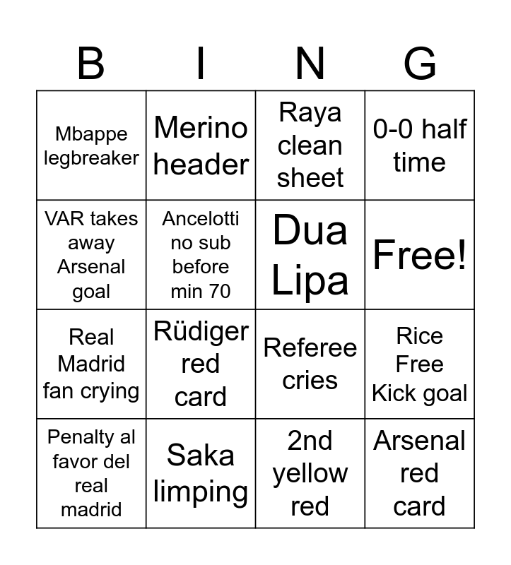 This bingo card has 17 words: 2nd yellow red, Penalty al favor del real madrid, Raya clean sheet, Mbappe legbreaker, Rüdiger red card, 0-0 half time, Rice Free Kick goal, Dua Lipa, Free!, Ancelotti no sub before min 70, Saka limping, Referee cries, VAR takes away Arsenal goal, Merino header, Real Madrid fan crying, Arteta yellow card and Arsenal red card.