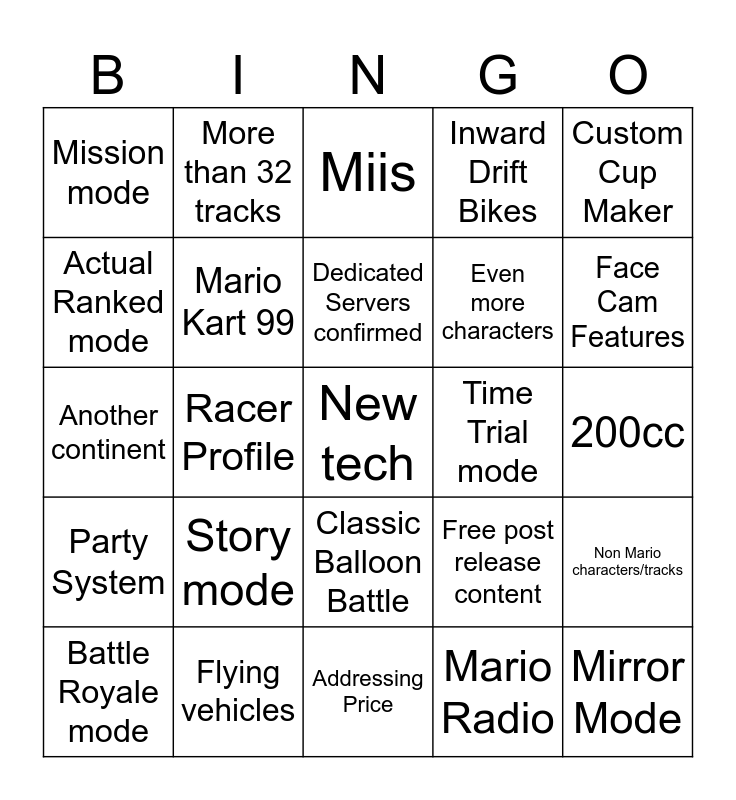 This bingo card has a free space and 24 words: Story mode, Flying vehicles, Dedicated Servers confirmed, Battle Royale mode, Custom Cup Maker, Mission mode, Actual Ranked mode, More than 32 tracks, Time Trial mode, Classic Balloon Battle, Even more characters, Another continent, Free post release content, Non Mario characters/tracks, Mario Kart 99, Mario Radio, 200cc, Miis, Face Cam Features, Racer Profile, Mirror Mode, Party System, Inward Drift Bikes and Addressing Price.