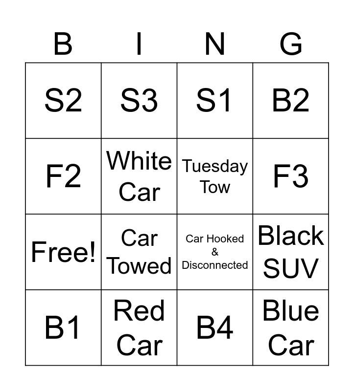 This bingo card has 20 words: Black SUV, F1, S1, B3, B1, F2, Red Car, S2, Free!, S3, Car Towed, Car Hooked & Disconnected, White Car, Blue Car, Tuesday Tow, Tow Arrives No Connection, F3, B2, B4 and B5.