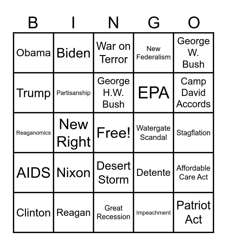 This bingo card has a free space and 24 words: Nixon, Reagan, George H.W. Bush, Clinton, George W. Bush, Obama, Trump, Biden, Watergate Scandal, Desert Storm, EPA, Reaganomics, Detente, Affordable Care Act, Partisanship, Impeachment, Stagflation, War on Terror, Camp David Accords, New Right, Patriot Act, AIDS, New Federalism and Great Recession.