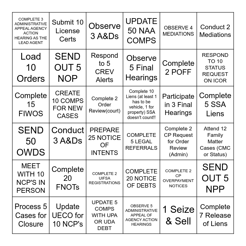 This bingo card has 36 words: COMPLETE 20 NOTICE OF DEBTS, COMPLETE 2 UIFSA REGISTRATIONS, OBSERVE 5 ADMINISTRATIVE APPEAL OF AGENCY ACTION HEARINGS, Load 10 Orders, SEND 50 OWDS, Complete 10 Liens (at least 1 has to be vehicle, 1 for property) SSA doesn't count!!, SEND OUT 5 NOP, UPDATE 5 COMPS WITH UPA OR UDA DEBT, OBSERVE 4 MEDIATIONS, COMPLETE 2 CP OVERPAYMENT NOTICES, RESPOND TO 10 STATUS REQUEST ON ICOR, UPDATE 50 NAA COMPS, SEND OUT 5 NPP, CREATE 10 COMPS FOR NEW CASES, Observe 5 Final Hearings, COMPLETE 3 ADMINISTRATIVE APPEAL AGENCY ACTION HEARING AS THE LEAD AGENT, MEET WITH 10 NCP'S IN PERSON, Participate in 3 Final Hearings, Complete 15 FIWOS, Observe 3 A&Ds, Complete 2 Order Review(court), Conduct 3 A&Ds, COMPLETE 5 LEGAL REFERRALS, PREPARE 25 NOTICE OF INTENTS, Complete 2 CP Request for Order Review (Admin), Submit 10 License Certs, Complete 2 POFF, Update UECO for 10 NCP's, Respond to 5 CREV Alerts, Conduct 2 Mediations, Complete 7 Release of Liens, Process 5 Cases for Closure, Attend 12 Family Matter Cases (CMC or Status), Complete 5 SSA Liens, Complete 20 FNOTs and 1 Seize & Sell.