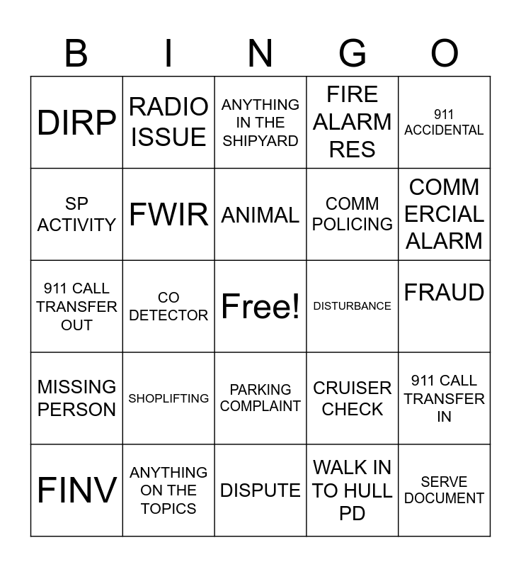 This bingo card has a free space and 39 words: MVC, BOLO, MEDICAL, FWIR, FINV, PARKING COMPLAINT, ANIMAL, BUILDING CHECK, 911 ACCIDENTAL, MISSING PERSON, CO DETECTOR, FIRE ALARM RES, SERVE DOCUMENT, FRAUD, DISTURBANCE, SHOPLIFTING, EROP, DIRP, PDIN, CRUISER CHECK, SP ACTIVITY, DISPUTE, COMM POLICING, COMM ERCIAL ALARM, RES ALARM, WBCK, BRUSH FIRE, LOCKOUT, LIFT ASSIST, RADIO ISSUE, ANYTHING ON THE BLVD, ANYTHING IN DERBY SHOPS, ANYTHING IN THE SHIPYARD, ANYTHING ON THE TOPICS, WALK IN TO HULL PD, LOBBY OF HIN POLICE, 911 CALL TRANSFER IN, 911 CALL TRANSFER OUT and CHECK OF THEFORTS.