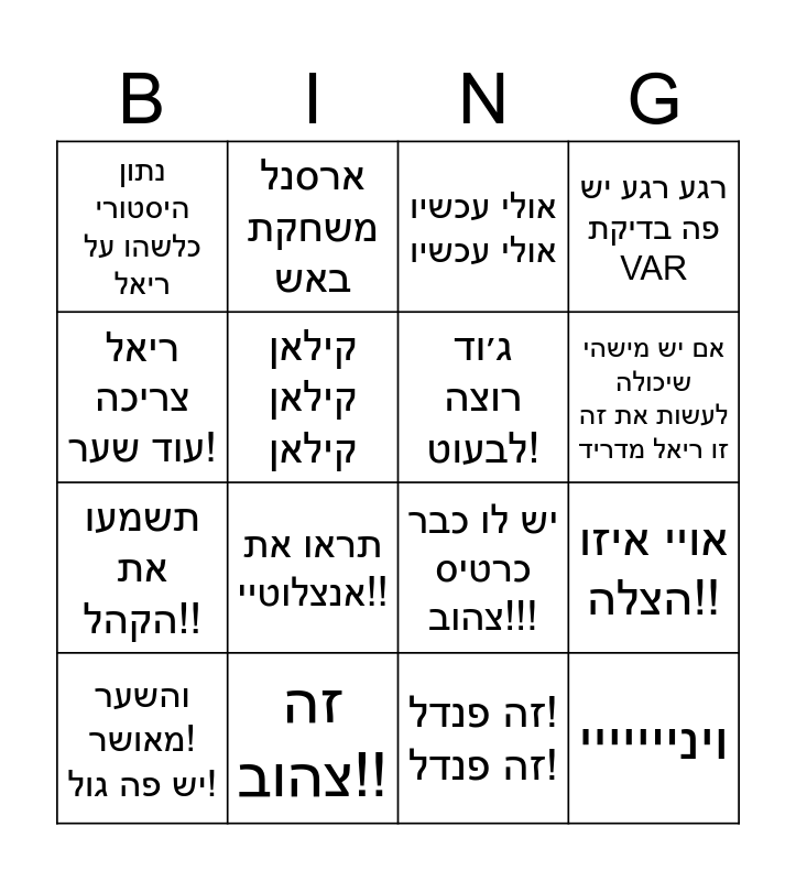 This bingo card has 16 words: זה צהוב!!, אויי איזו הצלה!!, אולי עכשיו אולי עכשיו, נתון היסטורי כלשהו על ריאל, תשמעו את הקהל!!, ארסנל משחקת באש, יש לו כבר כרטיס צהוב!!!, זה פנדל! זה פנדל!, ריאל צריכה עוד שער!, קילאן קילאן קילאן, והשער מאושר! יש פה גול!, רגע רגע יש פה בדיקת VAR, תראו את אנצלוטיי!!, אם יש מישהי שיכולה לעשות את זה זו ריאל מדריד, ג׳וד רוצה לבעוט! and וינייייייי.