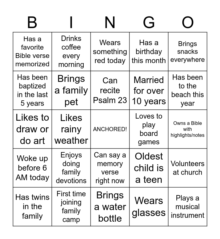 This bingo card has a free space and 60 words: Has 3 or more kids, First time joining family camp, Family sings together, Woke up before 6 AM today, Wears glasses, Favorite dish is adobo, Brings a family pet, Comes from a different town, Married for over 10 years, Wears matching shirts with family, Has a birthday this month, Is a Sunday School teacher, Has been baptized in the last 5 years, Traveled over 2 hours to camp, Family prays together daily, Has a favorite Bible verse memorized, Plays a musical instrument, Brings snacks everywhere, Has read the Bible cover to cover, Can recite Psalm 23, Loves to play board games, Wears something red today, Has twins in the family, Volunteers at church, Is the youngest sibling, Likes to cook, Can ride a bike, Likes hiking or nature walks, Has been to the beach this year, Speaks 3 or more languages, Family leads worship at church, Brought grandparents to camp, Knows how to swim, Has 5 or more cousins, Drinks coffee every morning, Knows how to make pancit, Enjoys gardening, Likes rainy weather, Family loves movie nights, Likes to draw or do art, Knows a Bible story by heart, Enjoys doing family devotions, Owns a Bible with highlights/notes, Can whistle a worship song, Oldest child is a teen, Favorite fruit is mango, Loves to bake, Has attended this camp before, Has a pet dog or cat, Can say a memory verse right now, Brings a water bottle, Has the same last name as someone else at camp, Likes to sing loudly during worship, Has a family group photo on their phone, Knows the camp theme verse, Can name 3 Bible characters, Owns a devotional journal, Came to camp in a van or SUV, Is wearing sandals or slippers and Has a family member in the church choir.