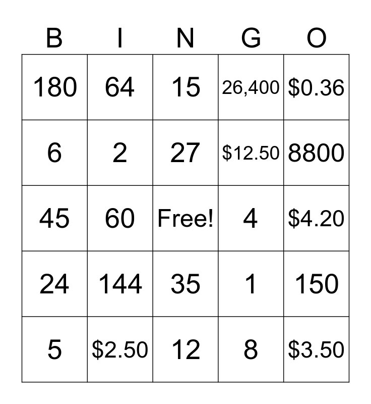 This bingo card has a free space and 24 words: 144, $2.50, 27, 5, $0.36, 180, 6, 64, 4, 35, $12.50, 45, 1, 150, 2, 8, $4.20, 15, 8800, 60, $3.50, 24, 26,400 and 12.