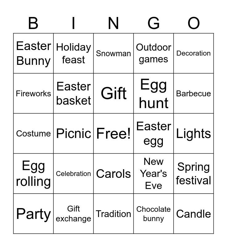 This bingo card has a free space and 25 words: Celebration, Tradition, Gift, Party, Decoration, Easter Bunny, Fireworks, Holiday feast, Easter egg, Carols, Egg hunt, Costume, New Year's Eve, Spring festival, Easter basket, Gingerbread, Lights, Snowman, Barbecue, Picnic, Candle, Gift exchange, Egg rolling, Outdoor games and Chocolate bunny.