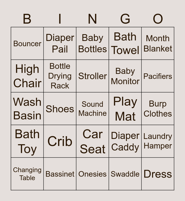 This bingo card has a free space and 24 words: Crib, Bassinet, Stroller, Changing Table, Month Blanket, Bouncer, High Chair, Diaper Pail, Play Mat, Car Seat, Baby Monitor, Wash Basin, Diaper Caddy, Laundry Hamper, Bottle Drying Rack, Swaddle, Burp Clothes, Baby Bottles, Pacifiers, Shoes, Dress, Bath Toy, Bath Towel and Onesies.