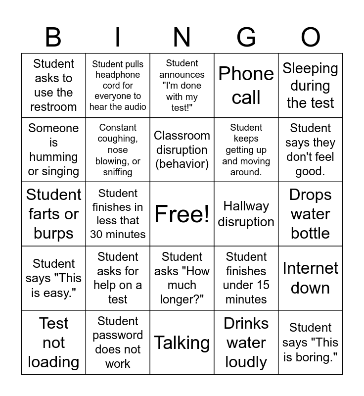This bingo card has a free space and 24 words: Student asks for help on a test, Student password does not work, Classroom disruption (behavior), Test not loading, Sleeping during the test, Student asks to use the restroom, Someone is humming or singing, Student pulls headphone cord for everyone to hear the audio, Hallway disruption, Student asks "How much longer?", Student keeps getting up and moving around., Student farts or burps, Student finishes under 15 minutes, Internet down, Constant coughing, nose blowing, or sniffing, Drinks water loudly, Drops water bottle, Student announces "I'm done with my test!", Student says they don't feel good., Student finishes in less that 30 minutes, Student says "This is boring.", Student says "This is easy.", Phone call and Talking.
