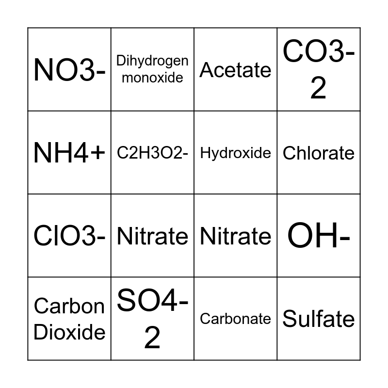 This bingo card has 19 words: Nitrate, Phosphate, Acetate, Sulfate, OH-, NH4+, Carbonate, NO3-, Dihydrogen monoxide, ClO3-, Nitrate, C2H3O2-, Hydroxide, SO4-2, Carbon Dioxide, Ammonium, CO3-2, Chlorate and PO4-3.