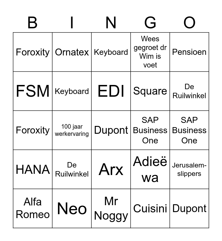 ⚠ This card has duplicate items: Arx (2), Dupont (2), Wim-win situatie (2), Mr Noggy (2), De Ruilwinkel (2), Conveni (2), Ornatex (2), Wees gegroet dr Wim is voet (2), FSM (2), Portretrecht (2), Keyboard (2), Neo (2), Jerusalem-slippers (2), Adieë wa (2), Mayfran (2), Ik ben geen ontwikkelaar!! (2), EDI (2), SAP Business One (2), HANA (2), Pensioen (2), 100 jaar werkervaring (2), Cuisini (2), Foroxity (2), Square (2)