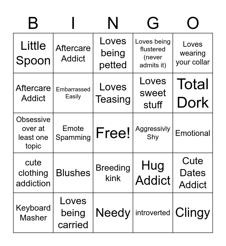 This bingo card has a free space and 29 words: Keyboard Masher, Pouting, Emote Spamming, Never makes typos, Little Spoon, Loves being petted, Embarrassed Easily, Blushes, Aggressivly Shy, Loves being carried, Emotional, Clingy, Needy, introverted, Total Dork, Either Replies fast,or never, Breeding kink, cute clothing addiction, Loves wearing your collar, Obsessive over at least one topic, Hug Addict, Orally obsessed, Loves sweet stuff, Aftercare Addict, Loves being flustered (never admits it), Aftercare Addict, Cute Dates Addict, Loves Teasing and Adorable Noises/Mannerisms.