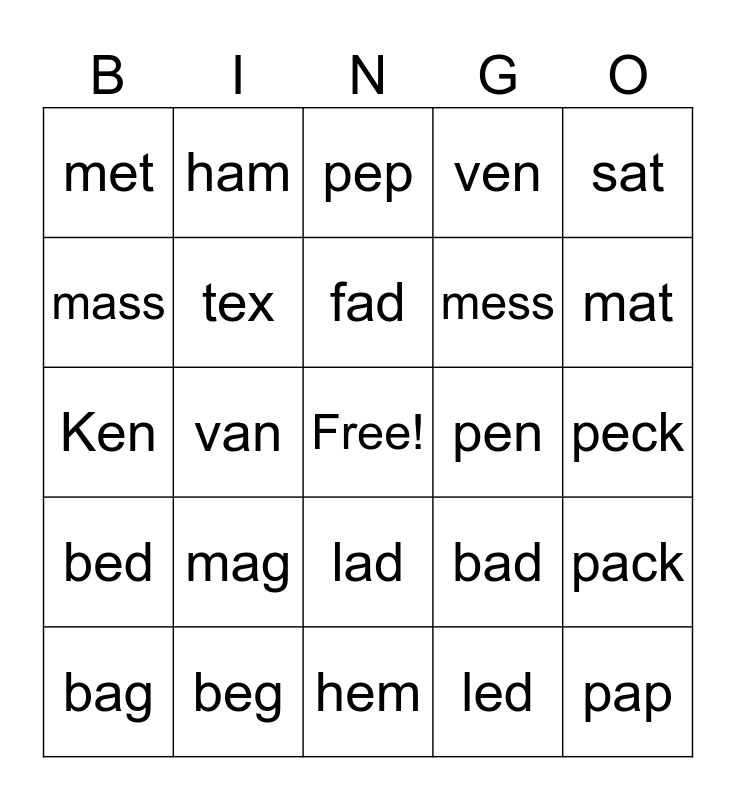 This bingo card has a free space and 36 words: man, men, tax, tex, bad, bed, fad, fed, sat, set, van, ven, pan, pen, mat, met, Meg, mag, pap, pep, peck, pack, beg, bag, hem, ham, Ken, can, mess, mass, ten, tan, led, lad, end and and.