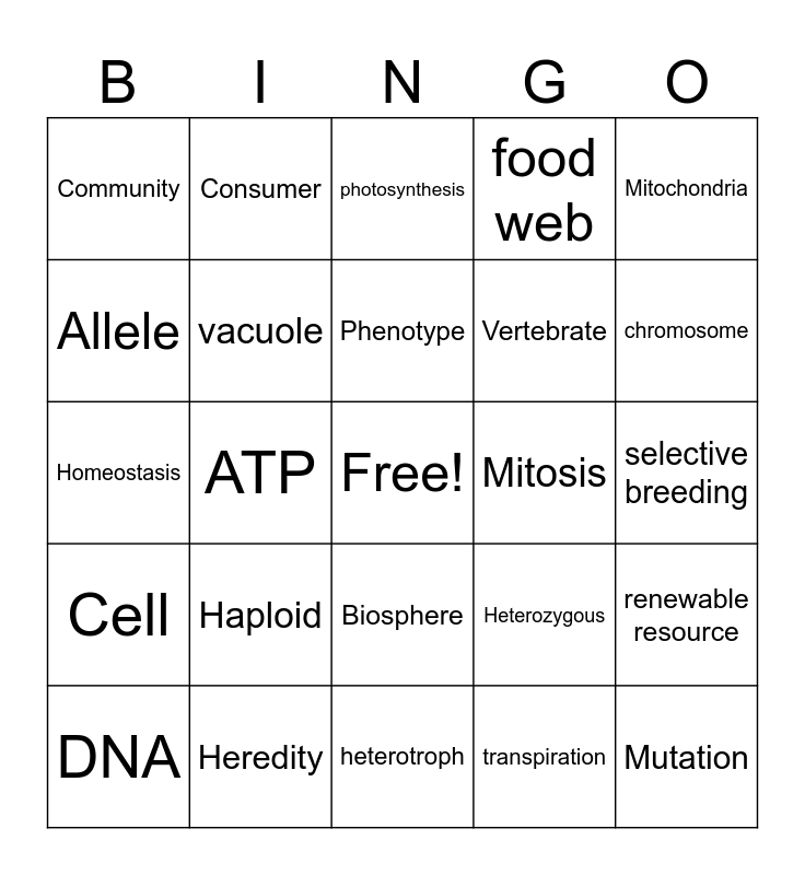 This bingo card has a free space and 24 words: Haploid, Heredity, Phenotype, DNA, Mitochondria, Community, Allele, Consumer, Mitosis, Biosphere, Vertebrate, Homeostasis, Heterozygous, renewable resource, vacuole, transpiration, selective breeding, photosynthesis, chromosome, ATP, Mutation, Cell, food web and heterotroph.