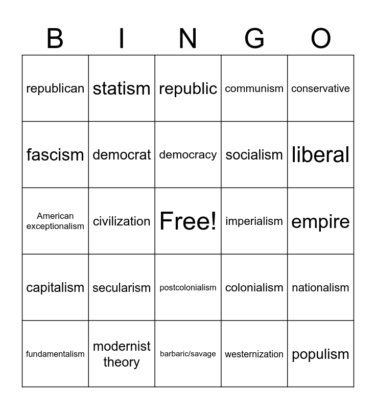This bingo card has a free space and 24 words: secularism, modernist theory, democracy, fundamentalism, conservative, republican, fascism, statism, imperialism, postcolonialism, socialism, American exceptionalism, colonialism, nationalism, democrat, westernization, empire, republic, liberal, civilization, populism, capitalism, communism and barbaric/savage.