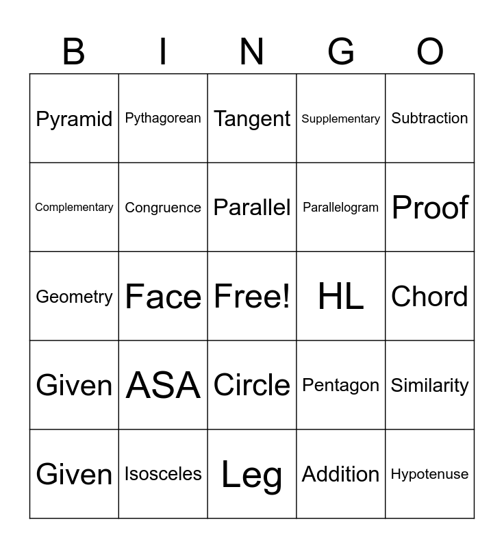 This bingo card has a free space and 64 words: Proportion, Base, Diameter, Similarity, Rectangle, Mean, Pythagorean, AAS, Parallel, Corresponding, Circle, Substitution, Chord, Subtraction, Statement, Complementary, Face, Pyramid, SSS, Parallelogram, ASA, Given, Supplementary, Scalene, Interior, Secant, Radius, Exterior, Segment, Triangle, Nonagon, Equiangular, Sine, Diagonal, Proof, Given, Equilateral, Addition, Cylinder, Congruence, Geometry, HL, Cosine, Area, Volume, Hypotenuse, Isosceles, SAS, Pentagon, Square, Decagon, Hexagon, Leg, Heptagon, Line, Ray, Tangent, Rhombus, Perpendicular, Transitive, Octagon, Angle, Reason and Scale factor.