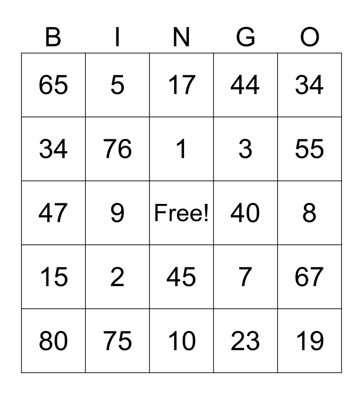 This bingo card has a free space and 24 words: 2, 75, 1, 80, 34, 65, 34, 5, 40, 45, 3, 47, 7, 67, 76, 23, 8, 17, 55, 9, 19, 15, 44 and 10.