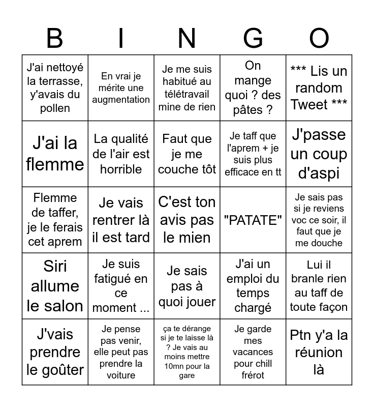 This bingo card has a free space and 24 words: Je suis fatigué en ce moment ..., Je pense pas venir, elle peut pas prendre la voiture, Faut que je me couche tôt, J'vais prendre le goûter, *** Lis un random Tweet ***, J'ai nettoyé la terrasse, y'avais du pollen, J'ai la flemme, En vrai je mérite une augmentation, "PATATE", Je sais pas à quoi jouer, Je taff que l'aprem + je suis plus efficace en tt, Flemme de taffer, je le ferais cet aprem, J'ai un emploi du temps chargé, Lui il branle rien au taff de toute façon, La qualité de l'air est horrible, Je garde mes vacances pour chill frérot, Je sais pas si je reviens voc ce soir, il faut que je me douche, Je me suis habitué au télétravail mine de rien, J'passe un coup d'aspi, Je vais rentrer là il est tard, Ptn y'a la réunion là, Siri allume le salon, On mange quoi ? des pâtes ? and ça te dérange si je te laisse là ? Je vais au moins mettre 10mn pour la gare.