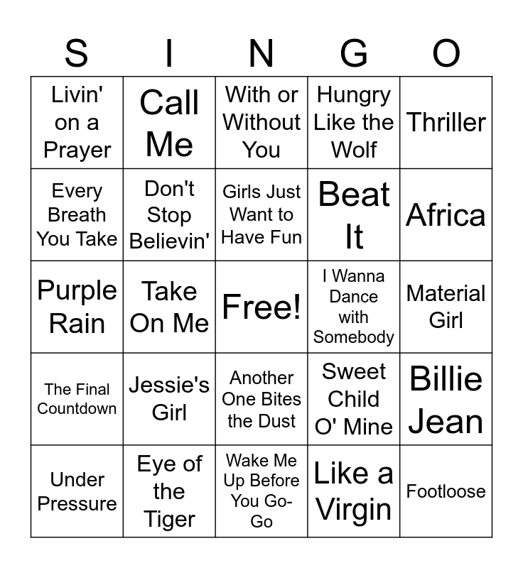 This bingo card has a free space and 24 words: Jessie's Girl, Eye of the Tiger, Girls Just Want to Have Fun, Under Pressure, Thriller, Livin' on a Prayer, Every Breath You Take, Call Me, I Wanna Dance with Somebody, Another One Bites the Dust, Beat It, Purple Rain, Sweet Child O' Mine, Billie Jean, Don't Stop Believin', Like a Virgin, Material Girl, With or Without You, Africa, Take On Me, Footloose, The Final Countdown, Hungry Like the Wolf and Wake Me Up Before You Go-Go.