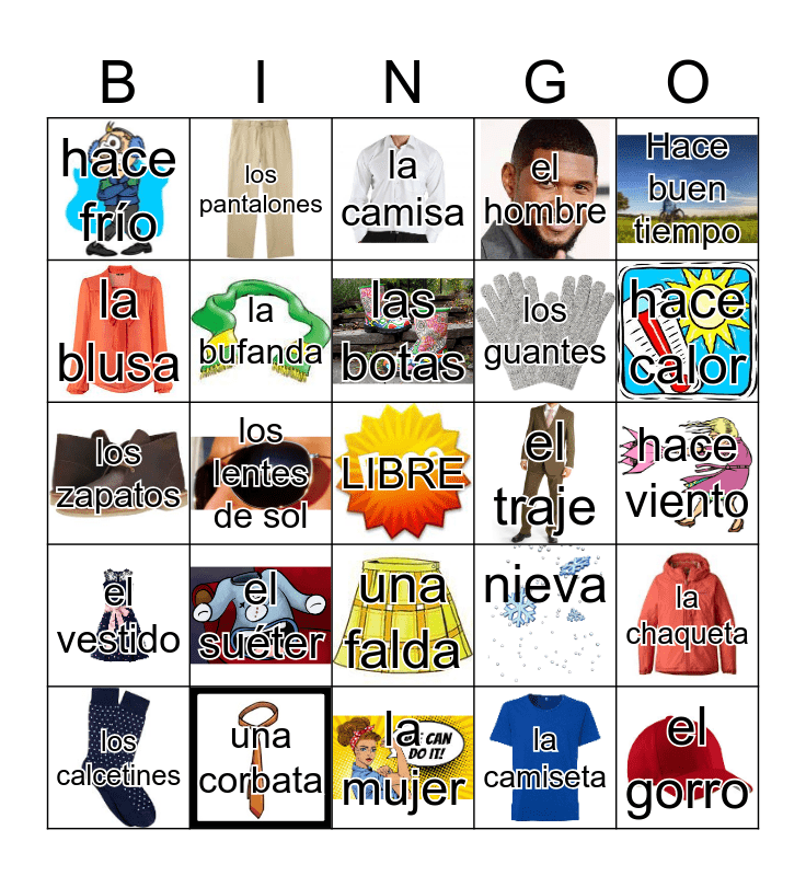 This bingo card has 28 images, a free space and 28 words: la chaqueta, el cinturón, los guantes, la camiseta, la blusa, la camisa, los pantalones, el vestido, el traje, los calcetines, los zapatos, el hombre, una corbata, la mujer, hace calor, llueve, el suéter, la bufanda, las botas, una falda, hace frío, los pijamas, el gorro, los lentes de sol, hace viento, nieva, Hace buen tiempo and Hace mal tiempo.