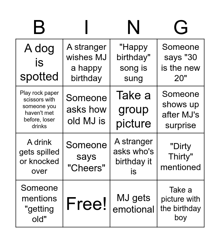 This bingo card has 16 words: Free!, "Dirty Thirty" mentioned, "Happy birthday" song is sung, A dog is spotted, A drink gets spilled or knocked over, A stranger wishes MJ a happy birthday, A stranger asks who's birthday it is, MJ gets emotional, Play rock paper scissors with someone you haven't met before, loser drinks, Someone asks how old MJ is, Someone mentions "getting old", Someone says "30 is the new 20", Someone says "Cheers", Someone shows up after MJ's surprise, Take a group picture and Take a picture with the birthday boy.