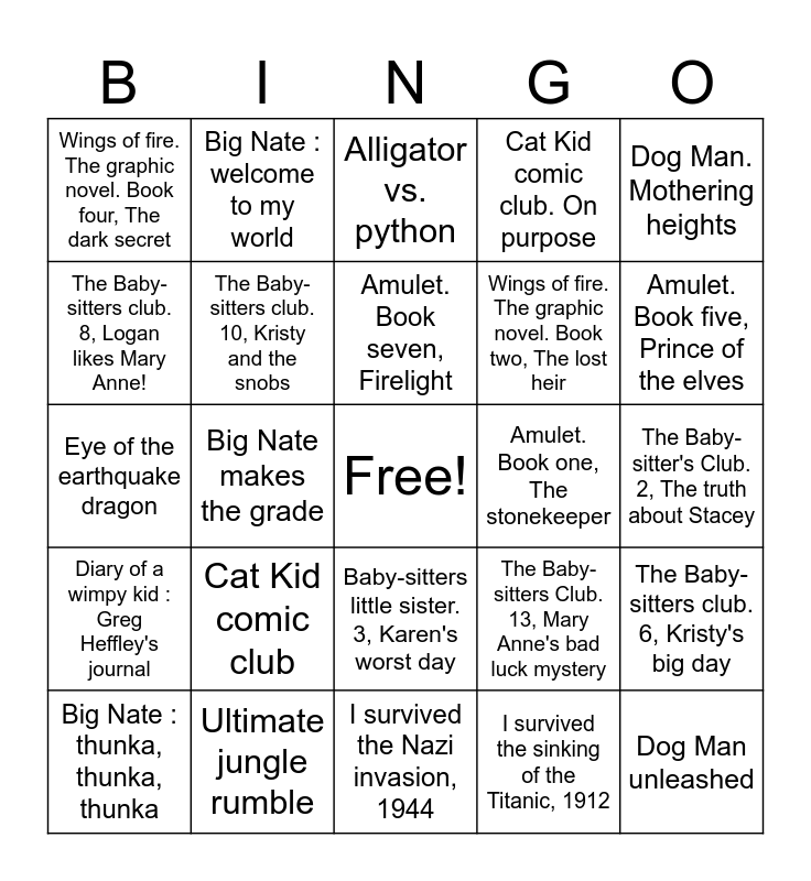 This bingo card has a free space and 50 words: Dog Man. Grime and punishment, Dog Man unleashed, Dog Man. For whom the ball rolls, I survived the Nazi invasion, 1944, Cat Kid comic club, The Baby-sitters club. 11, Good-bye Stacey, good-bye, Big Nate : welcome to my world, Cat Kid comic club. Collaborations, The Baby-sitters club. 8, Logan likes Mary Anne!, The Baby-sitters club. 12, Jessi's secret language, The Baby-sitters club. 10, Kristy and the snobs, Cat Kid comic club. On purpose, The Baby-sitters club. 6, Kristy's big day, The Baby-sitters Club. 13, Mary Anne's bad luck mystery, Wings of fire. The graphic novel. Book one, The dragonet prophecy, Wings of fire. The graphic novel. Book three, The hidden kingdom, Amulet. Book seven, Firelight, Amulet. Book one, The stonekeeper, Dog Man. Lord of the fleas, Dog Man. Mothering heights, Big Nate makes the grade, I survived the sinking of the Titanic, 1912, Wings of fire. The graphic novel. Book four, The dark secret, Wings of fire. The graphic novel. Book two, The lost heir, The Baby-sitters Club. 14, Stacey's mistake, Dog Man. The scarlet shedder, Amulet. Book five, Prince of the elves, The book with no pictures, Alligator vs. python, Baby-sitters little sister. 3, Karen's worst day, Big Nate. The gerbil ate my homework, Creepy carrots!, I survived the Great Chicago Fire, 1871, Lobster vs. crab, Ultimate jungle rumble, The Baby-sitters club. 9, Claudia and the new girl, Baby-sitters little sister. 7, Karen's haircut, Big Nate : silent but deadly, Cat Kid comic club. Perspectives, The Baby-sitter's Club. 2, The truth about Stacey, Best friends, Big Nate. Blow the roof off!, Big Nate in the zone, Big Nate payback time!, Big Nate : thunka, thunka, thunka, Eye of the earthquake dragon, The Baby-sitters club. 5, Dawn and the impossible three, Baby-sitters little sister. 1, Karen's witch, Diary of a wimpy kid : Greg Heffley's journal and I survived the attacks of September 11, 2001.