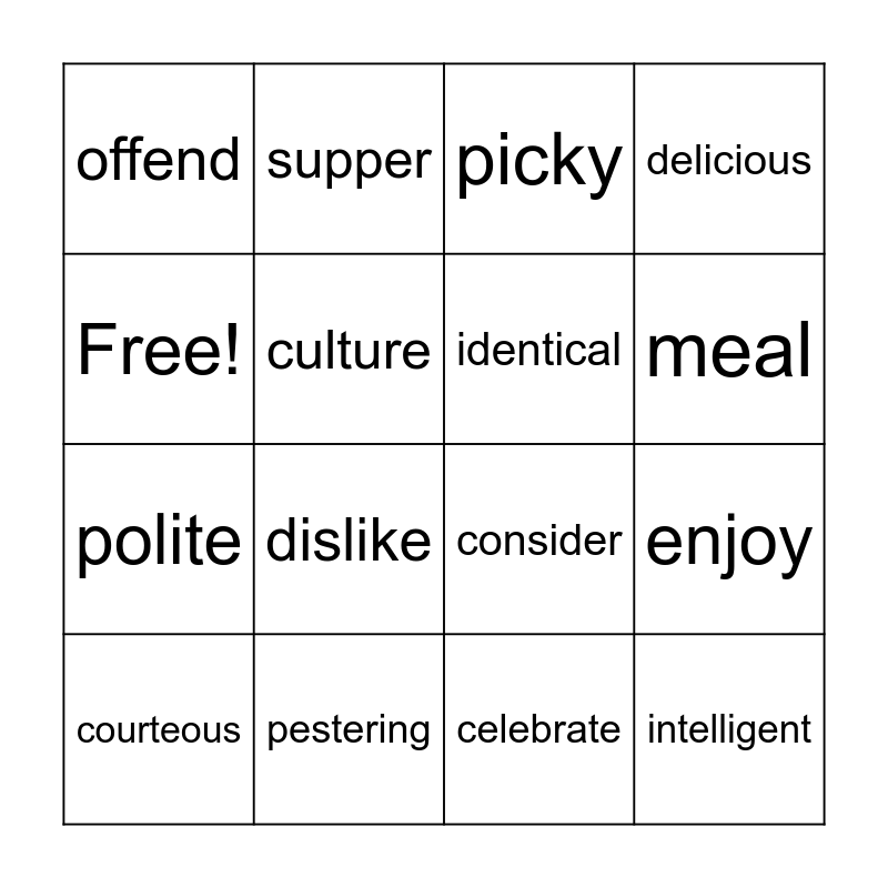 This bingo card has 16 words: pestering, enjoy, picky, offend, polite, supper, consider, celebrate, Free!, culture, courteous, delicious, dislike, meal, identical and intelligent.