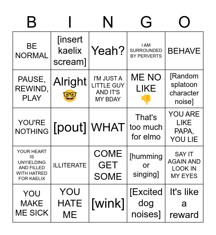 This bingo card has a free space and 24 words: ILLITERATE, YOU HATE ME, I'M JUST A LITTLE GUY AND IT'S MY BDAY, YOU MAKE ME SICK, BEHAVE, BE NORMAL, PAUSE, REWIND, PLAY, [insert kaelix scream], That's too much for elmo, COME GET SOME, ME NO LIKE 👎, YOU'RE NOTHING, [humming or singing], SAY IT AGAIN AND LOOK IN MY EYES, Alright 🤓, [Excited dog noises], YOU ARE LIKE PAPA, YOU LIE, Yeah?, [Random splatoon character noise], [pout], It's like a reward, YOUR HEART IS UNYIELDING AND FILLED WITH HATRED FOR KAELIX, I AM SURROUNDED BY PERVERTS and [wink].