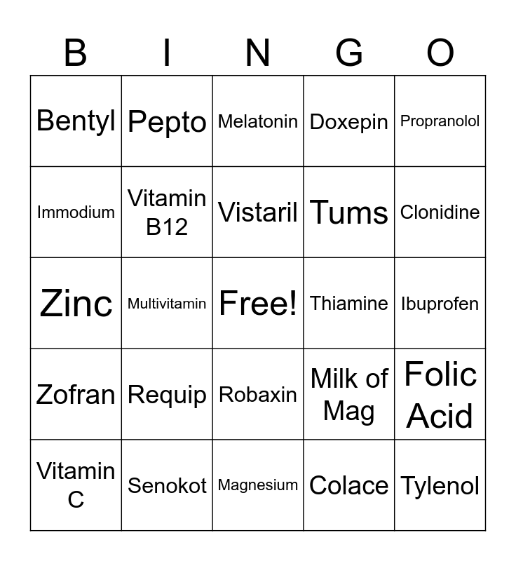 This bingo card has a free space and 24 words: Requip, Senokot, Vistaril, Vitamin C, Propranolol, Bentyl, Immodium, Pepto, Thiamine, Robaxin, Tums, Zinc, Milk of Mag, Folic Acid, Vitamin B12, Colace, Ibuprofen, Melatonin, Clonidine, Multivitamin, Tylenol, Zofran, Doxepin and Magnesium.